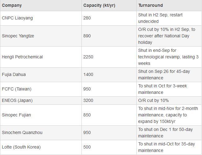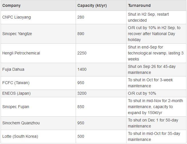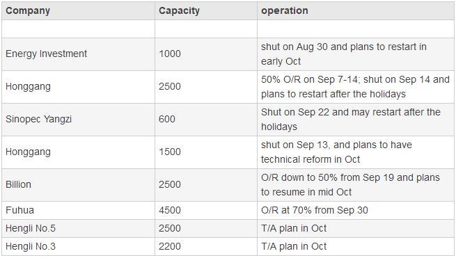 Demand: Downstream PTA plant maintenance would mostly take place in Oct, but would be limited in Nov and Dec.