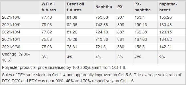 Supply: current polyester polymerization rate was above 81%, flatting with pre-holiday level. The regulation of energy consumption will decide the recovery of polyester polymerization rate and affect the launch of 2 million tons/year of new polyester capacity in the Q4. The polyester polymerization rate is estimated at 83%, 88% and 88% respectively in Oct-Dec.