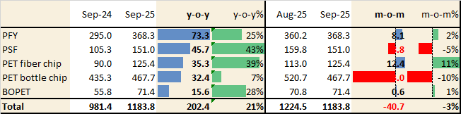 Overall, polyester exports in September rose 28% year-on-year, largely due to a low base last year, but fell 3% month-on-month.