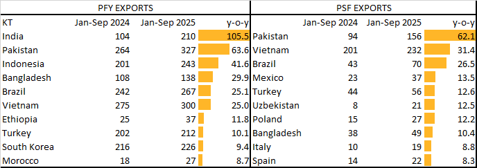 For polyester staple fiber, Pakistan again led the gains, up 11kt year-on-year in September, with cumulative growth mainly to Pakistan, Vietnam, and Brazil.
