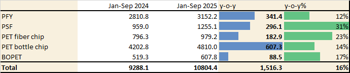 In terms of detailed indicators, the main drivers of growth in September were polyester filament, staple fiber, and film, all of which still recorded solid year-on-year increases. However, bottle-grade PET showed a relatively smaller year-on-year gain and a notable month-on-month decline.