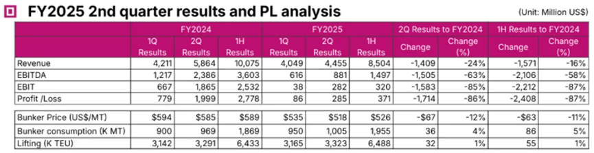 During the reporting period, Maersk achieved a revenue of 14.2 billion US dollars, a year-on-year decrease of 9.9%; earnings before interest and taxes (EBIT) were approximately 1.3 billion US dollars, down 61.2% y-o-y.